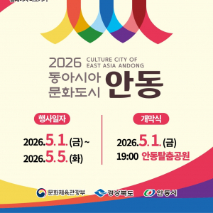 [안동=컬처GB신문] 동아시아 3국의 문화 교류를 상징하는 ‘2026 동아시아문화도시 안동’ 개막행사가 오는 5월 1일부터 5일까지 닷새간 안동 탈춤공원과 중앙선1942안동역, 원도심 일원에서 열린다. 이번 행사는 문화체육관광부와 경상북도, 안동시가 공동 주최하며 동아시아의 전통과 현대적 가치를 공유하는 다채로운 프로그램으로 구성된다.