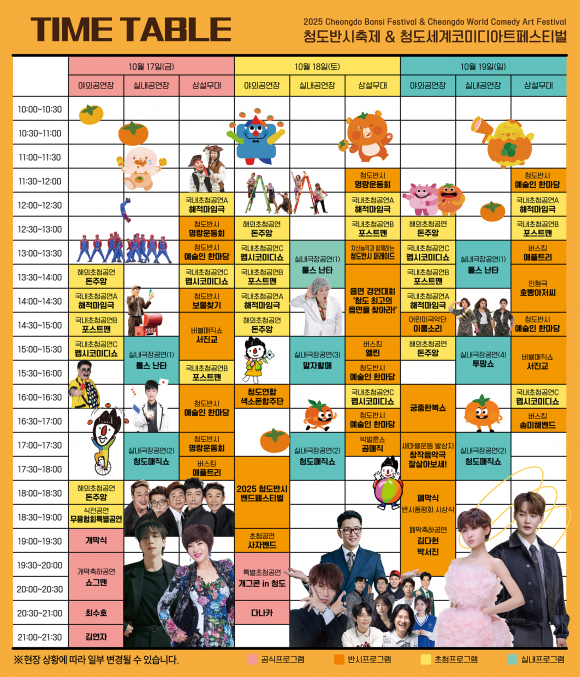 올해 축제는 지역 대표 행사인 ‘청도반시축제’와 동시에 열려, 청도 특산물 반시와 세계 각국의 코미디 아트가 어우러진 이색 융합축제로 주목받고 있다. 웃음과 감, 공연과 먹거리를 한자리에서 즐길 수 있는 전 세대 참여형 문화축제로 기획됐다.