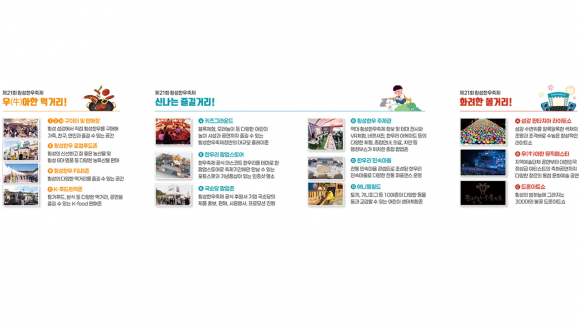 특히 10월 22일과 25일에는 300대의 드론이 횡성의 밤하늘을 수놓는 ‘드론 아트쇼’가 예정되어 있다. 레이저, 불꽃, 조명 등 다양한 멀티미디어가 결합된 스토리텔링형 미디어 퍼포먼스로, 방문객들에게 새로운 감동을 전할 예정이다.