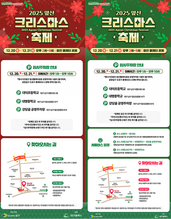 대구 지역에서 유일하게 크리스마스를 테마로 한 축제이기도 한 만큼, 남구는 올해 더욱 확장된 콘텐츠와 화려한 연출로 방문객들의 만족도를 높인다는 계획이다.